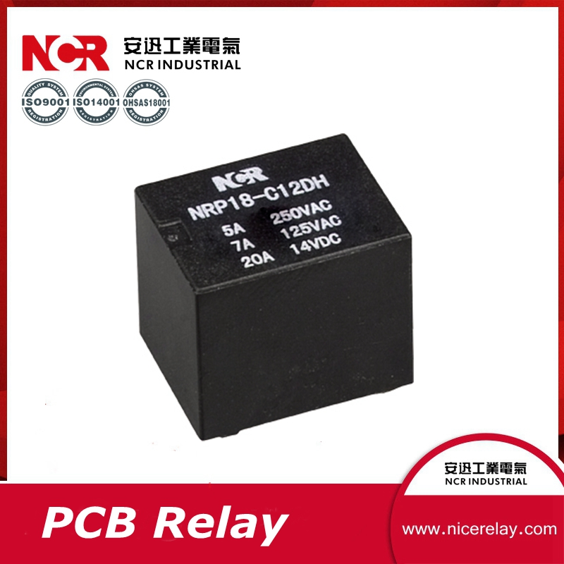 7A MINI PCB Relay NRP18-12VDCCharacteristic1,20A swtich capabilities.2,Subminiature, stand PC layout3,High resistance to vibration.4,Low power consupumption 0.6W,0.8W.5,Outline size:15.7x12.3x14mmSpecificationPacking &DeliveryQualification CertificationProduction facilitiesLaboratoryAbout USNCR,......